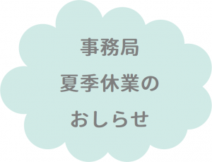 事務局 夏季休業のおしらせ 2019年8月26日 (月) 〜 8月30日 (金)までの期間、 夢絵コンテスト事務局は夏季休業となります。 お電話でのお問合せは、9月2日(月)10時以降にお願いします。 また、メールでのお問合せにつきましては、9月2日より順次対応いたします。 どうぞよろしくお願いいたします。 NPO法人こどもネットミュージアム 夢絵コンテスト事務局 月・火・木・金 10:00~16:00
