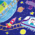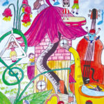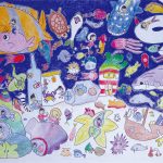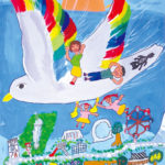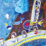 未来への夢、アイデアがいっぱいつまった絵にたくさん出会うことができました。絵の具やパス、色鉛筆やカラーペン、貼り絵など、重なりあう画材からも皆さんの想像力や創造力の広がりを豊かに感じることができました。