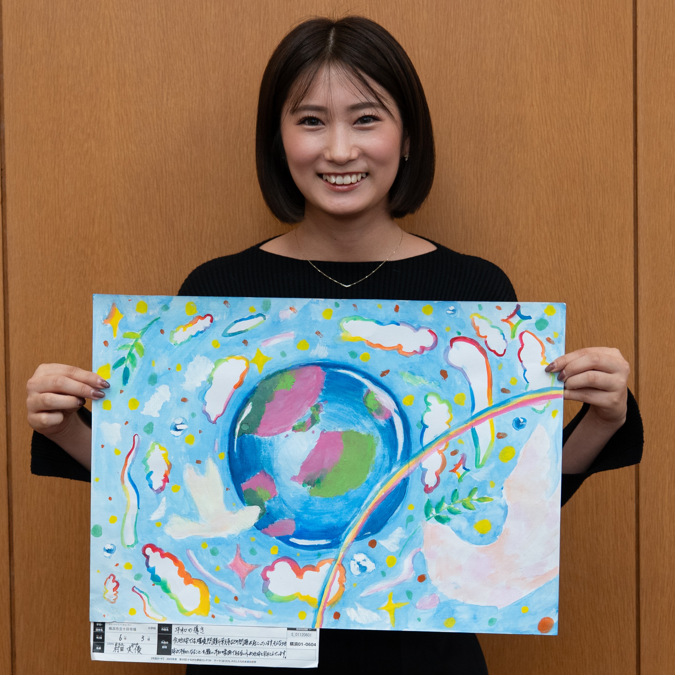 画用紙いっぱいに地球平和を象徴しているのが素敵でした。私たちの会社では多くの外国籍が在籍しているので日本だけでなくほかの国の幸せ、