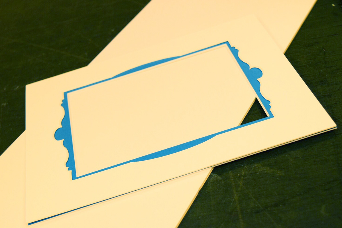 フレーミングされた夢絵を見て、作品を描いたお子さんが「わぁ、自分はこんなに良い絵を描いたんだ!」と、感じてもらえるようにしたいと思っています。そのための提案として、オリジナルのダブルマットを用いたフレームを作りました。四角、楕円、飾りの3つを組み合わせてデザインされたマットを、作品に合う色のカラーマットとコーディネートします。うちのお店にはデザインマットをカットする機械があるので、“描いた人の気持ちがあがるデザイン”というのを意識しながら、何度も試作を重ねてこのデザインが完成しました。細かい部分のカットは機械がなかなかいうことを聞いてくれず、苦労しましたけれどね(苦笑)