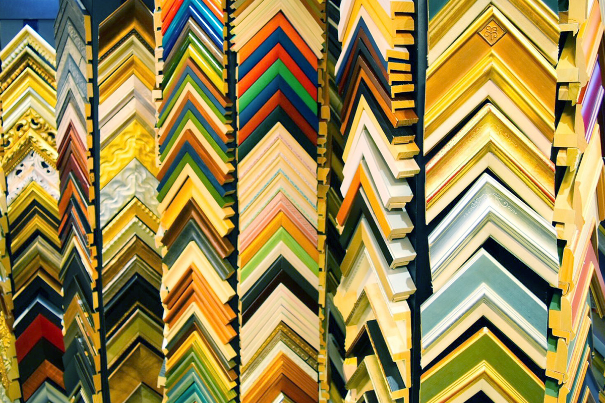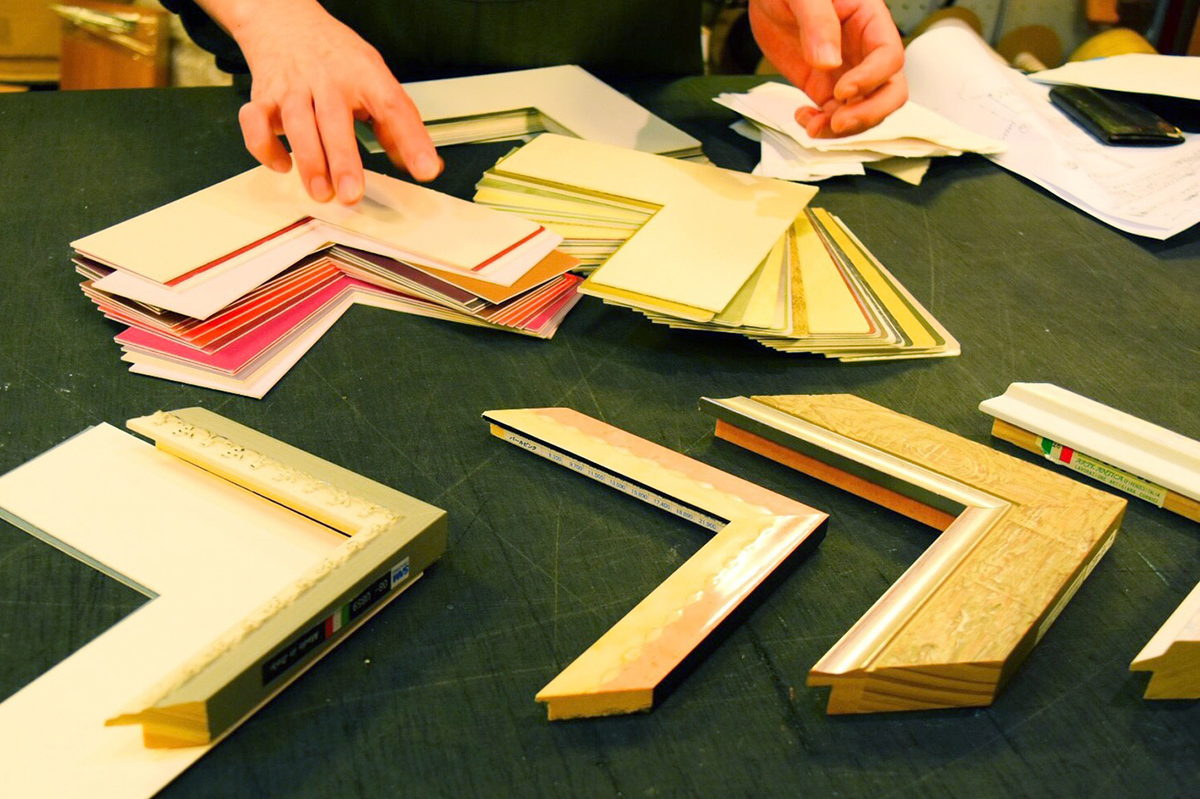 お客さまがお持ちになった絵に額縁(フレーム)をデザインするお仕事です。どんなフレームがいいか、約1,500~1,700種類もあるサンプルを使いながらコーディネートしていくのですが、手掛けていくうえで大切にしている2つのポイントがあります。まず一つ目が主役である作品をいかに魅力的にみせるかをよく考えること。そしてもう一つが、お客さまに合うデザインを提案していくということ。フレーミングを依頼された方の好みやこだわりを理解するだけでなく、実際に額縁を飾るお部屋の大きさやインテリアなど、目の前にはない情報を聞き出して、最適な提案をしていかなければなりません。